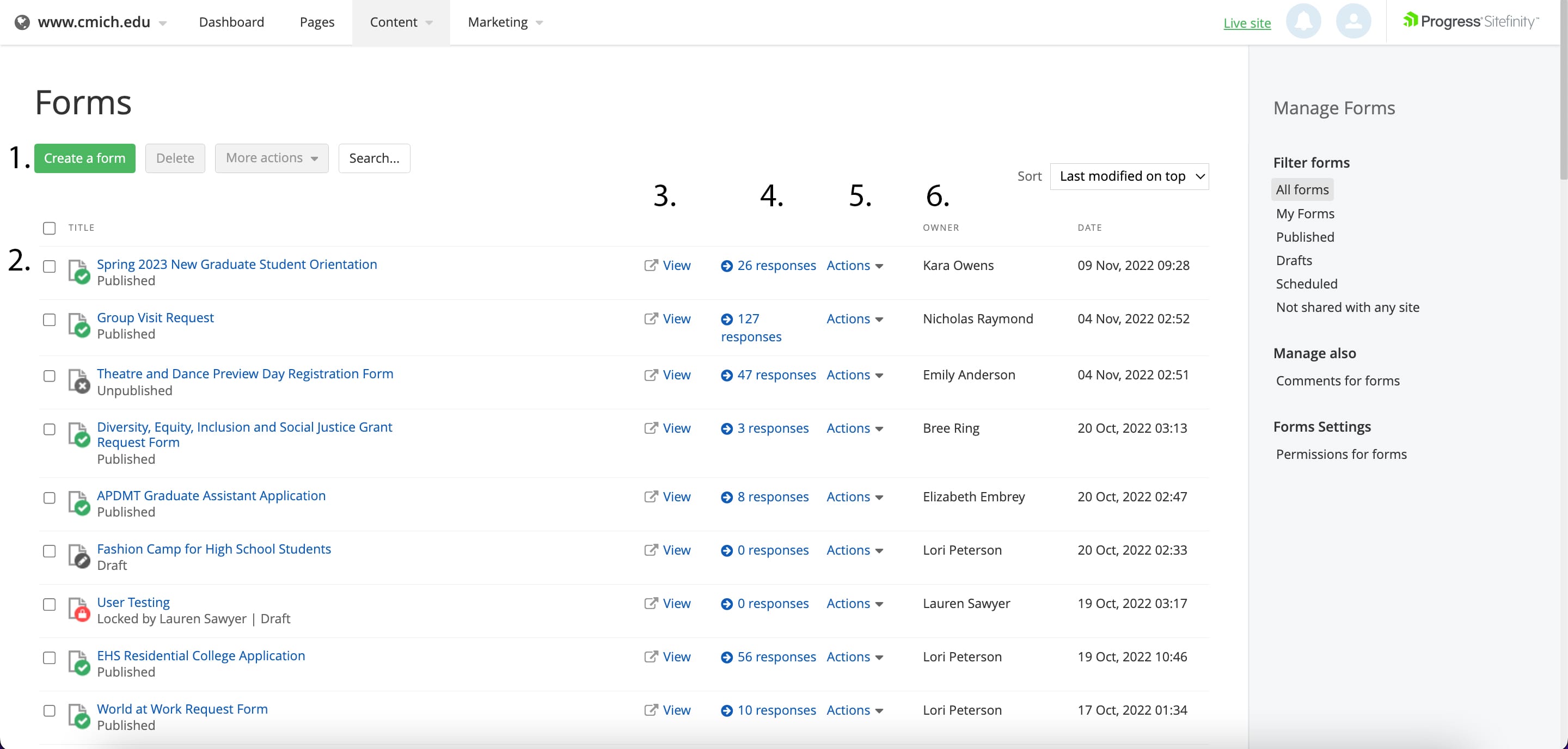 To access the Forms area of Sitefinity, in the top menu click on Content and select Forms from the drop down menu.