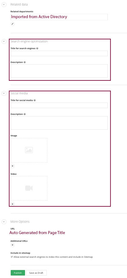 - Title for search engines (less than 70 characters): It will automatically fill in the name on the profile from Active Directory. It can be changed.
