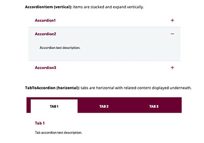 Organize and display short-form content in accordion (vertical) or tabbed (horizontal) format options.