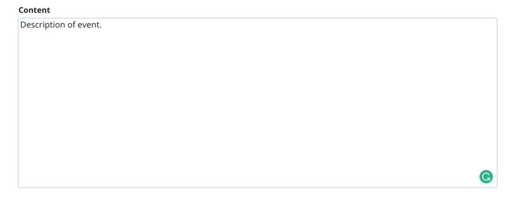 - The content area for Events functions identically to a content block on a page. There is not a strict character count for this section, but quick, scannable and easy-to-digest formatting is best. Date, time and location information should not be included as part of the Event Description as it will be entered and displayed elsewhere.