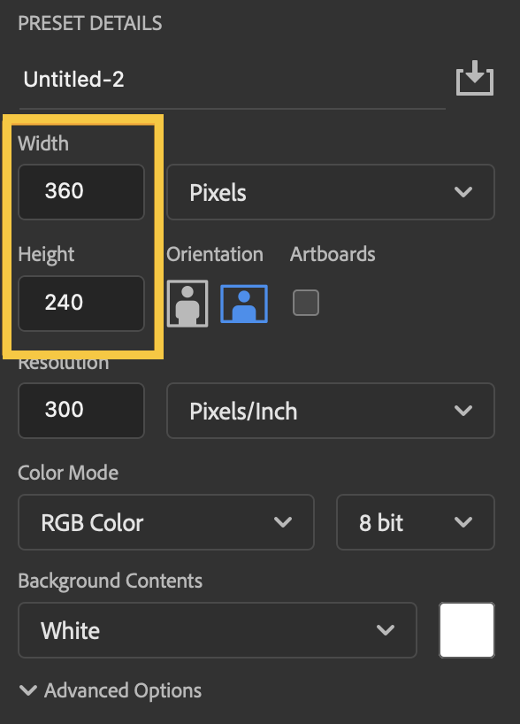 - Here, we're using the dimensions for a thumbnail image, 360 pixels wide by 240 pixels tall.